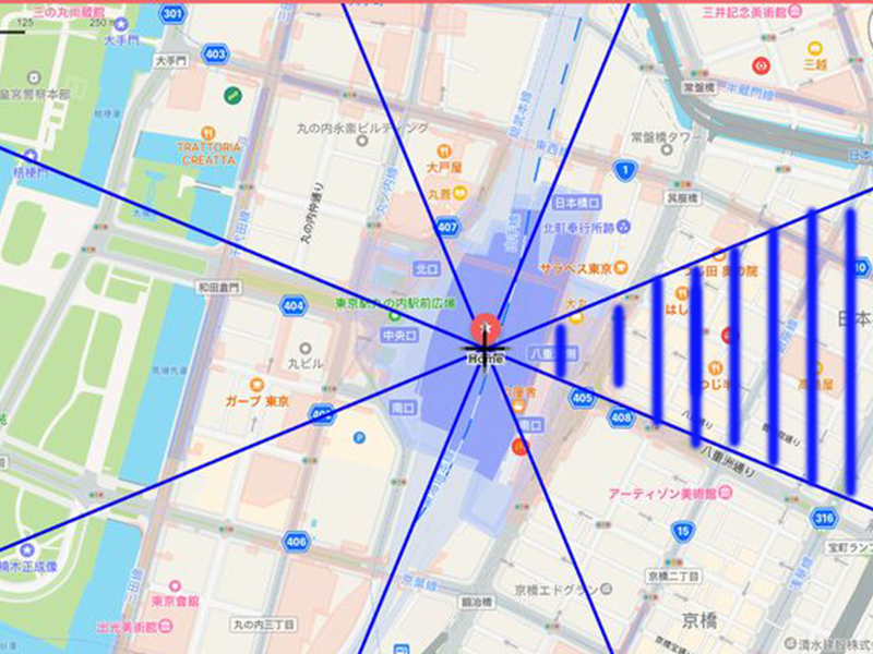 自宅を検索して、画面中央を自宅に設定し、方位線をつけるとどこが方位なのか?わかります。